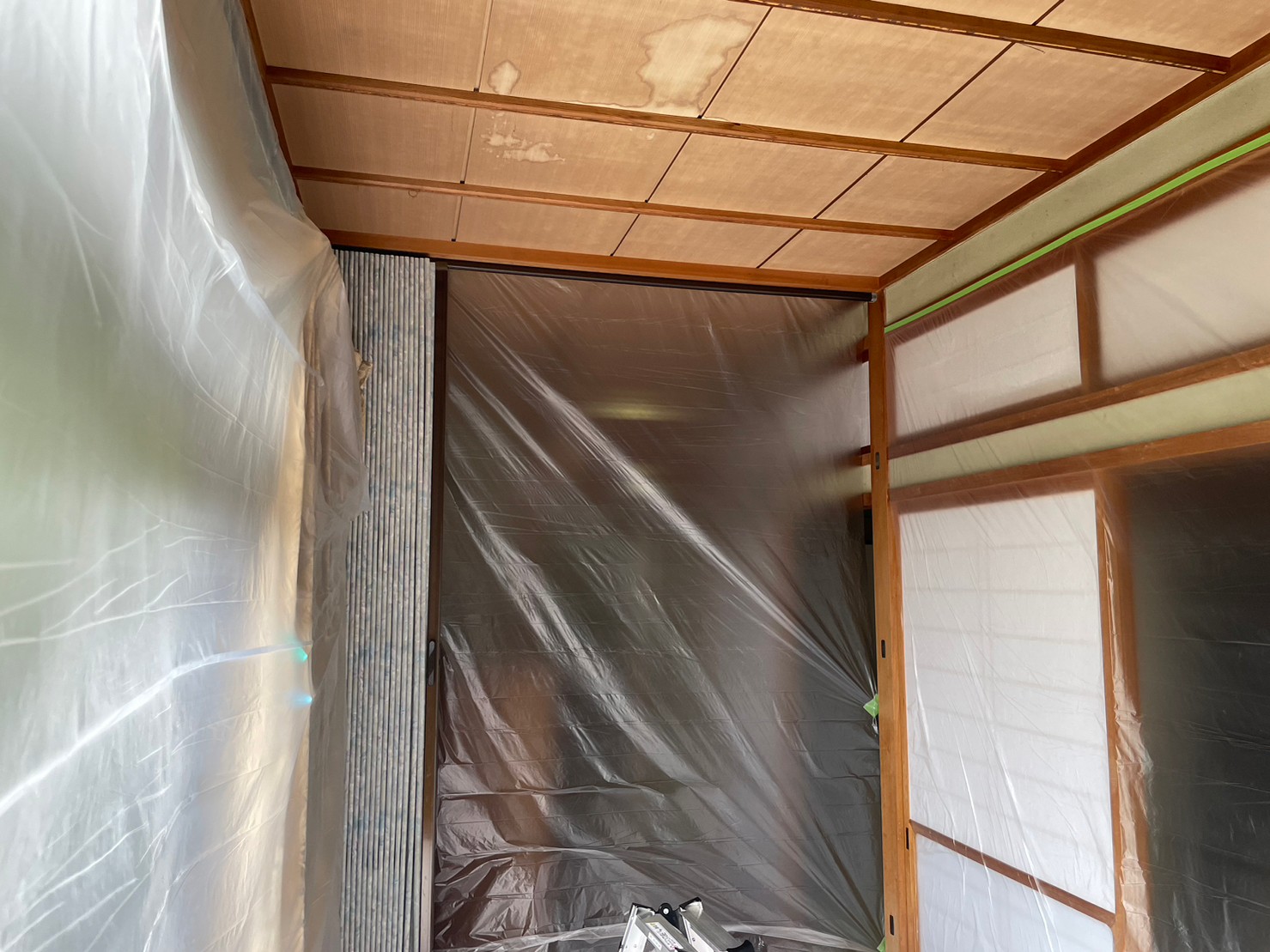 スタッフより - 今回の現場は天井板の腐食が進行しており、リビングと和室2箇所にベニア貼り補修が必要な深刻な状態でした。